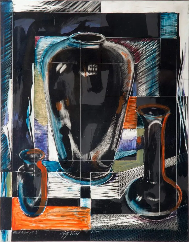 Black Amythyst is a very beautiful, colorful drawing using mixed media effects to create a stunning piece of art. With oil paint, watercolor, and ink added to an interesting still life of black amythyst vases,and texture added to the incising of the panel, the design works beautifully. This is a special work to add to your collection or to stand alone. Framed in black metal under glass.