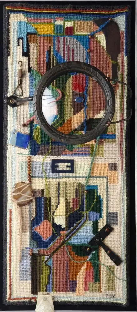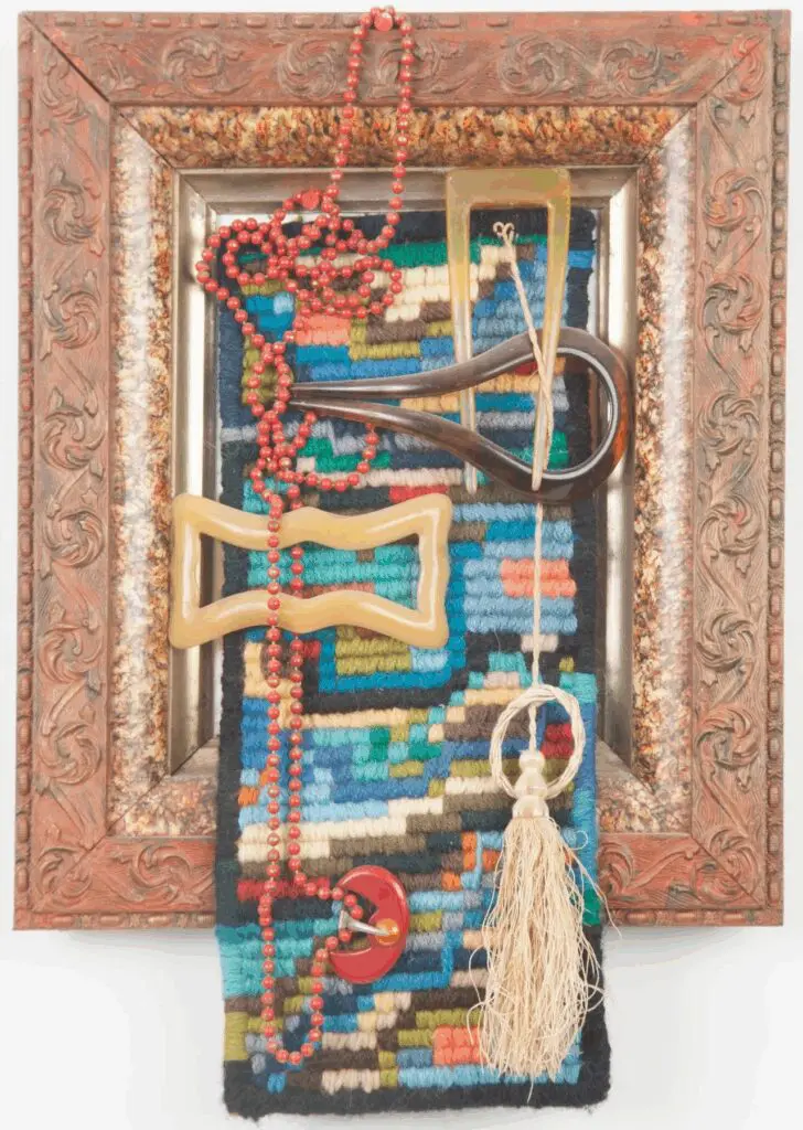 - TAPESTRIES OF MY MIND - SIG..............tapestry canvas, wool, found metal,found glass, found plastic...........21.5" x 9.5" x 4"..........$3700.00