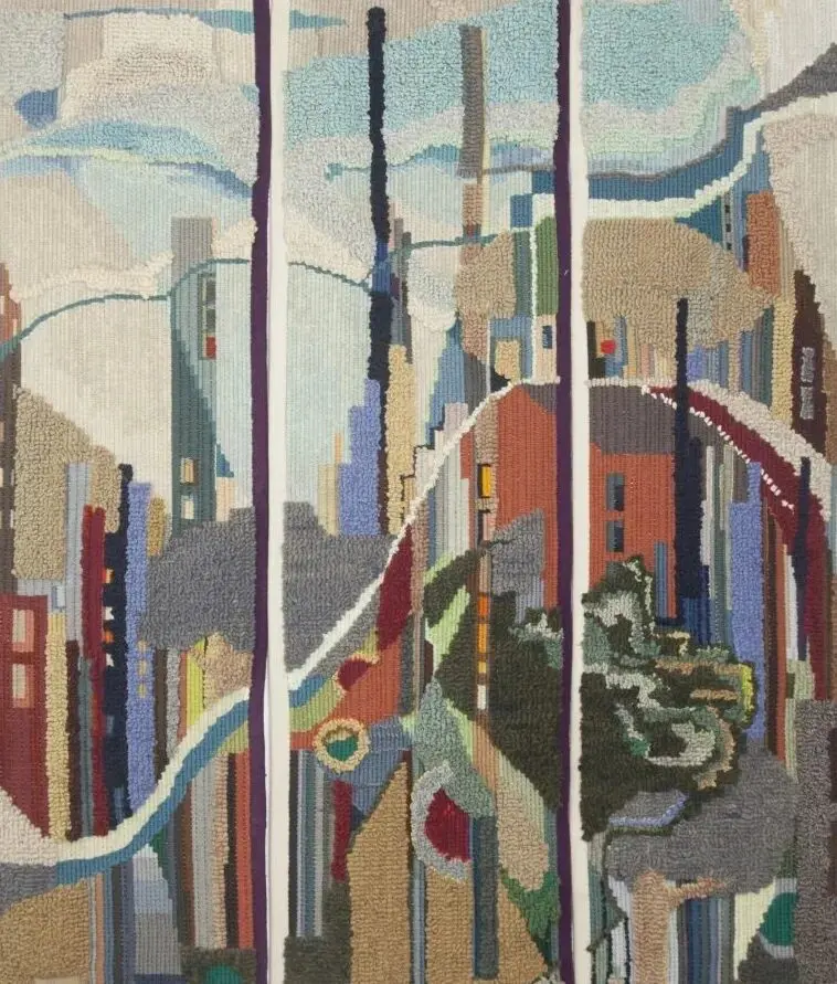 - TAPESTRY OF MY MIND SERIES -"CITY OF MY MIND"..............wool. wool fiber, mesh foundation ......Three panels, each 60" x 18"........$ 9000.00