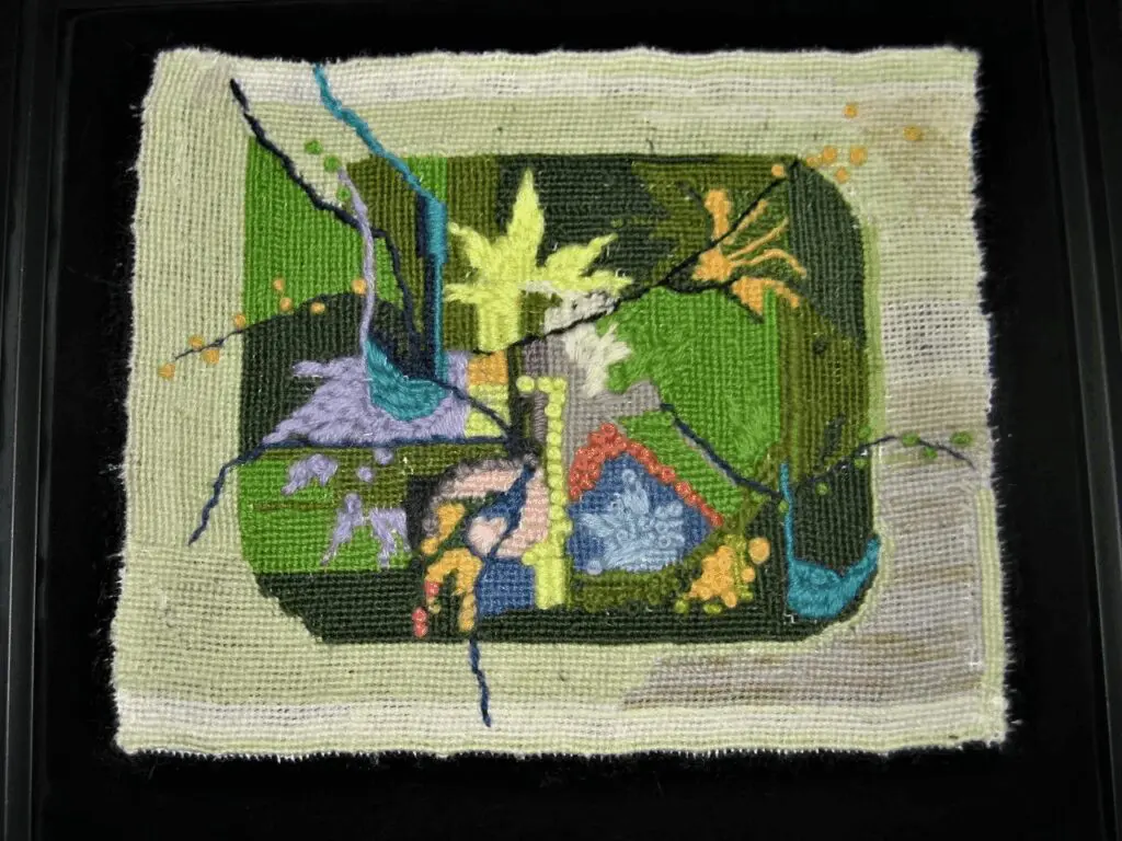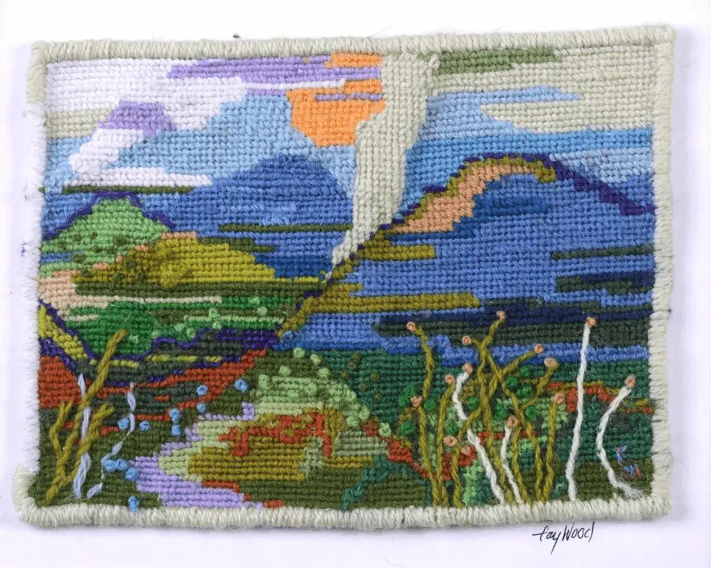 These are examples of the tapestry Wood has made for many years. They vary in size, from 4' x 5' approximately, to very small - 12" x 15". They are wall hangings created on either wool, canvas, or mesh backings using a wide variety of materials and stitches to create the design.